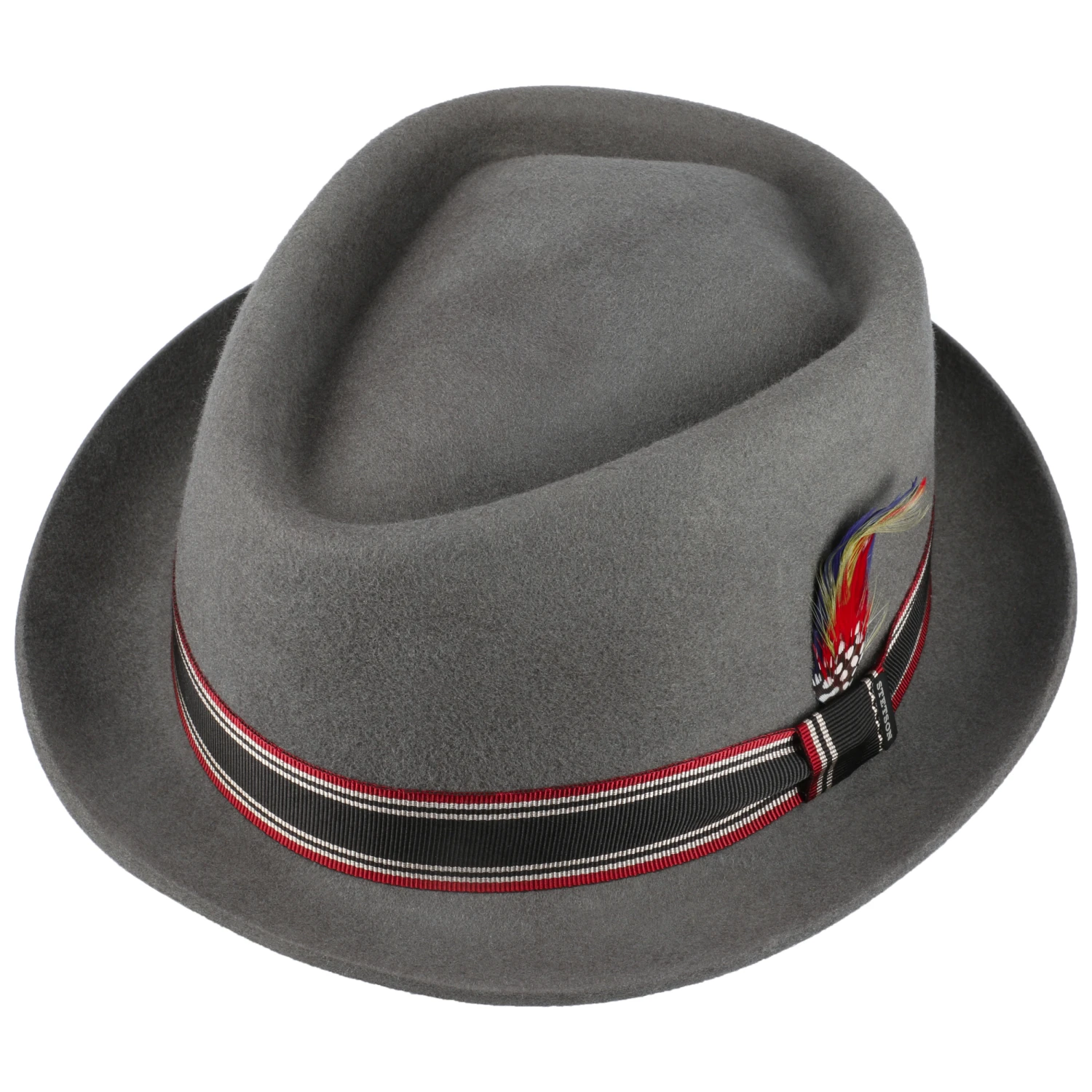 Der exklusive Pork Pie von Stetson ist zu 100% aus Wolle gefertigt und sorgt mit seinem Ripsband und der Federapplikation für einen gelungenen Auftritt.