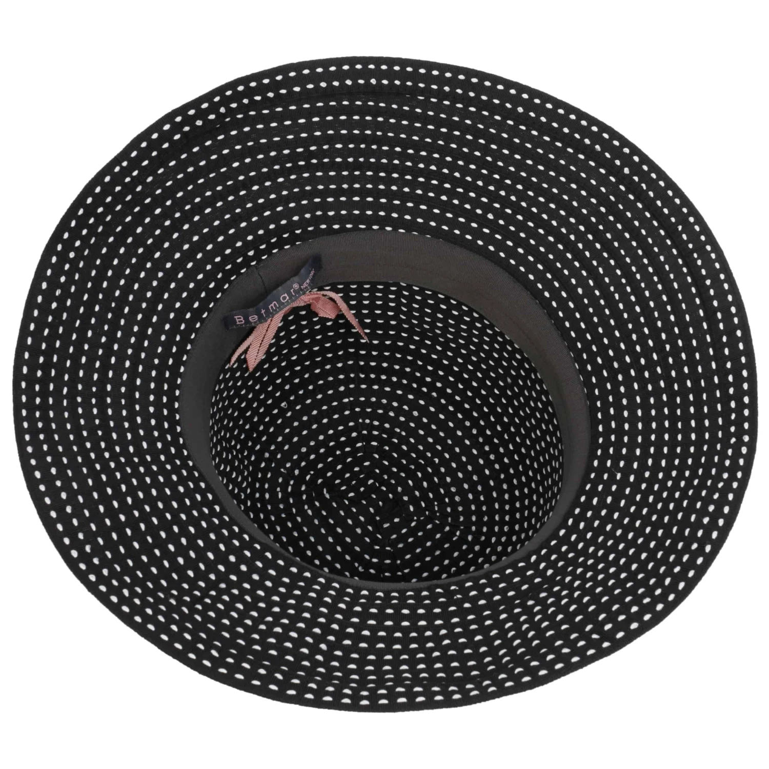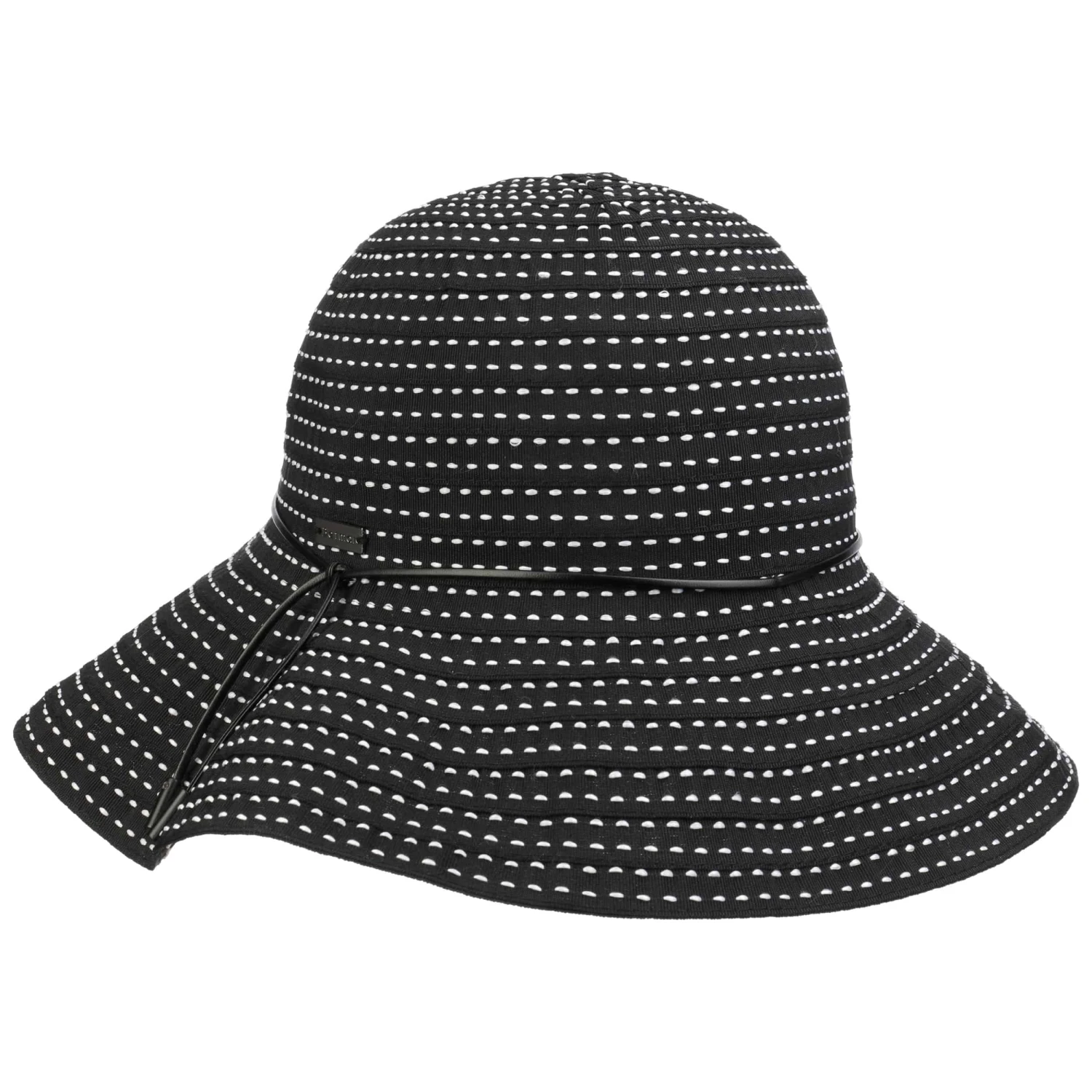 Die knautschbare Qualität verschafft dem Stoffhut einen ungemein bequemen Sitz und verleiht der Krempe charmante Lässigkeit. Dazu gesellt sich die unifarbene Basis mit unterbrochenen kontrastfarbenen Streifen in Punktoptik für die unaufdringlich elegante Note, abgerundet durch ein schmales Garniturband aus Kunstleder, seitlich darüber ein metallen schimmerndes Markenemblem.