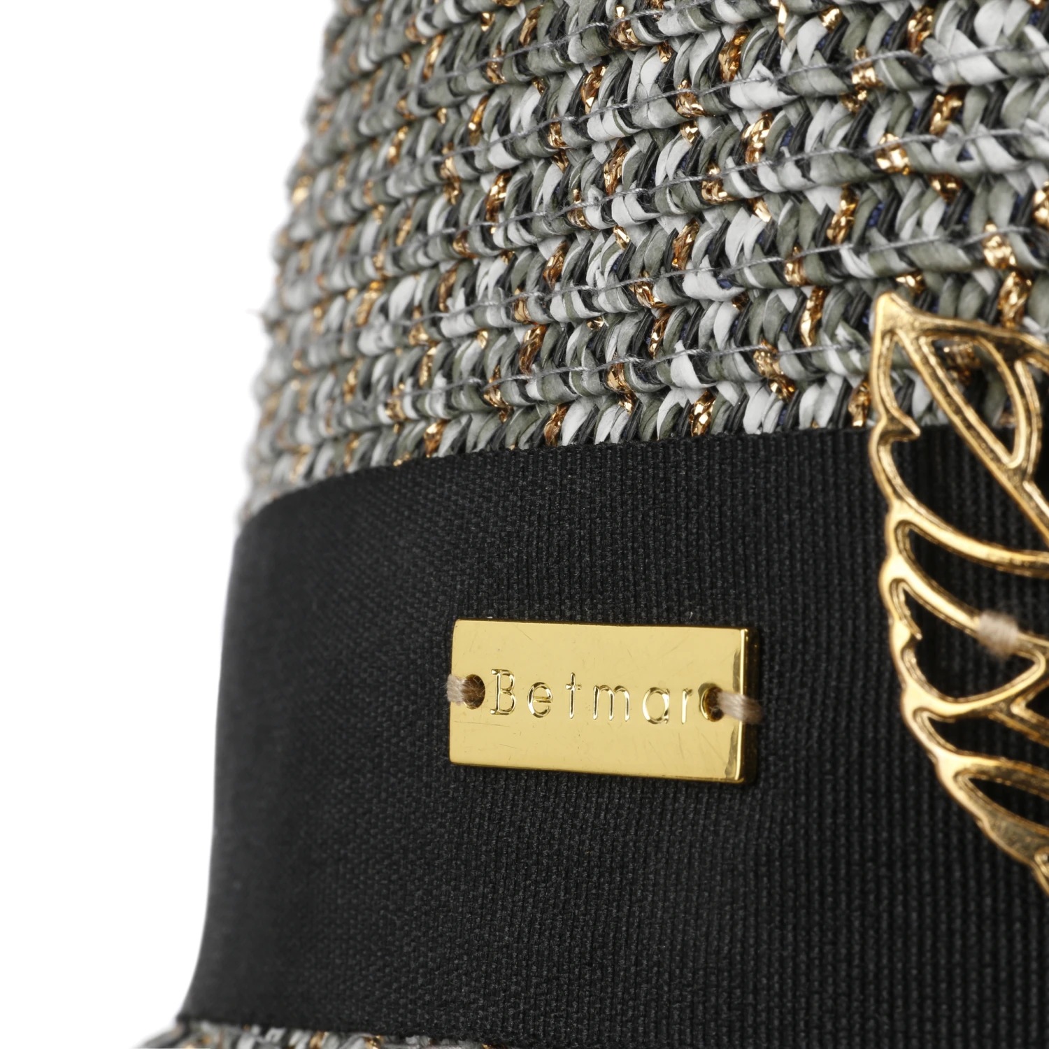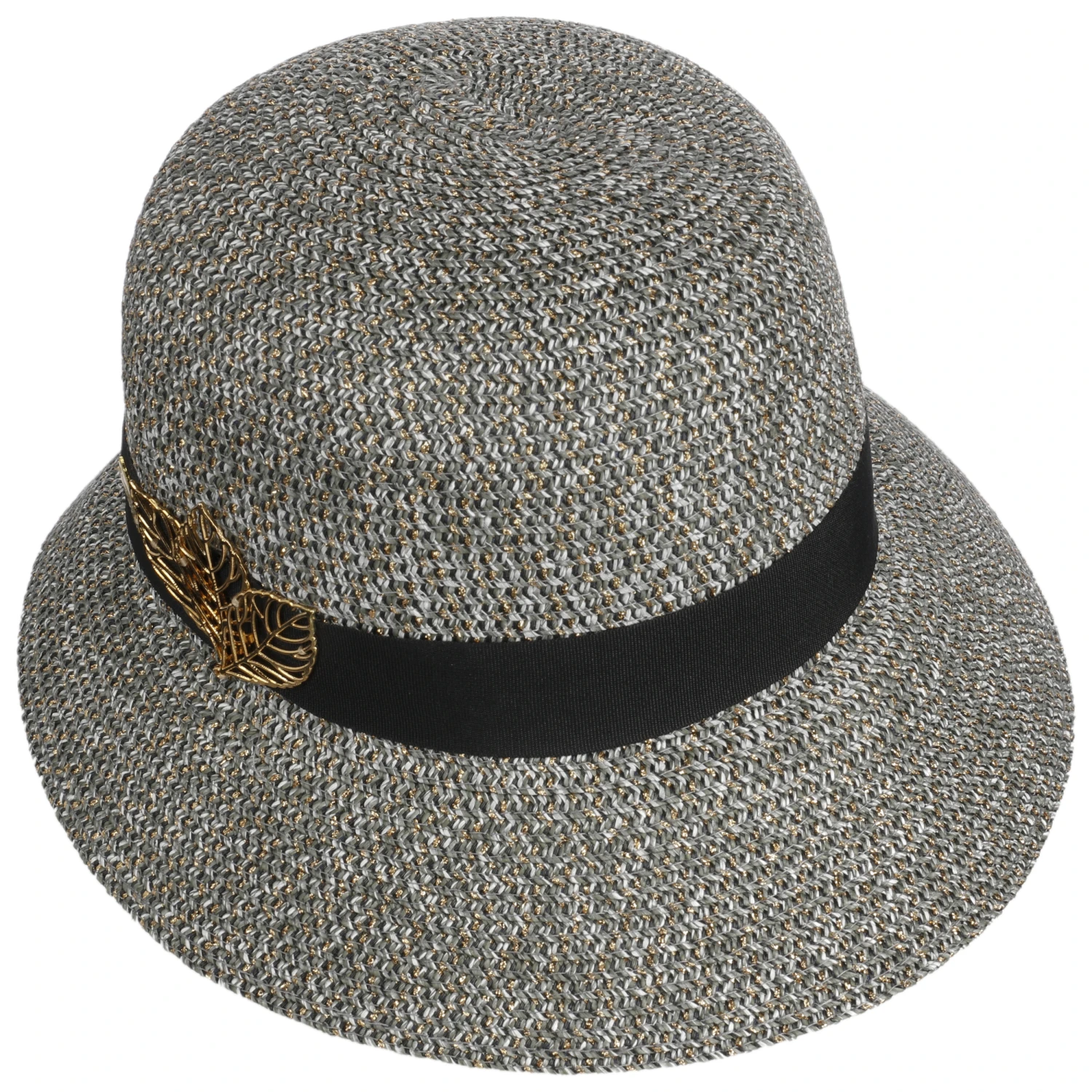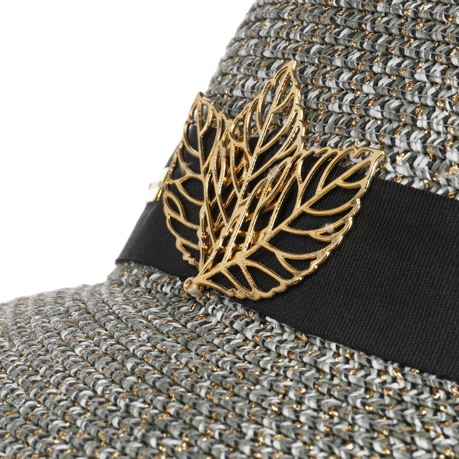 Als primärer Blickfang erweist sich die große Metallapplikation, die sich mit ihrem hellen Schimmer vom breiten Ripsband absetzt. Sie zeigt die filigranen Konturen dreier Laubblätter. Der charakteristische Metallglanz wird von Metallfasern wieder aufgegriffen, die regelmäßig in das stilvoll anmutende Flechtwerk des Hutes eingearbeitet sind.