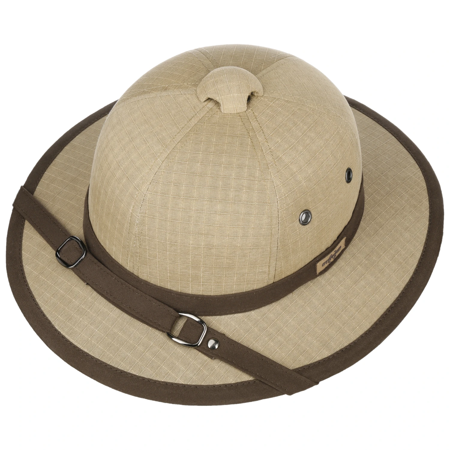 Die aus Baumwolle gefertigte Kopfbedeckung bringt einen nach Standard EN-13758-1 geprüften UV-A- und UV-B-Schutz mit, der sich etwas abgeschwächt auch auf die durch die Krempe beschatteten Hautbereiche erstreckt. Metallene Luftösen verschaffen dem Kopf ein angenehmes Klima, die um und quer über die Krempe verlaufende Garnitur punktet optisch.