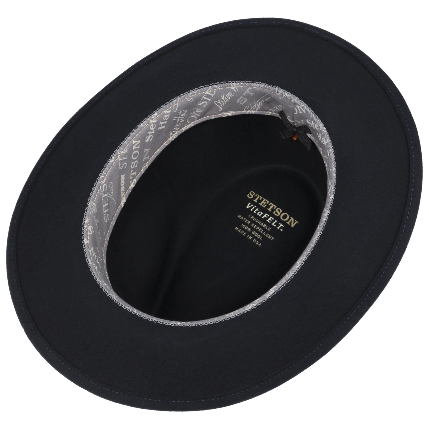 Wollfilz in VitaFelt-Qualität beschert dem Traveller von Stetson strapazierfähige und wasserabweisende sowie knautsch- und rollbare Eigenschaften für unterwegs.