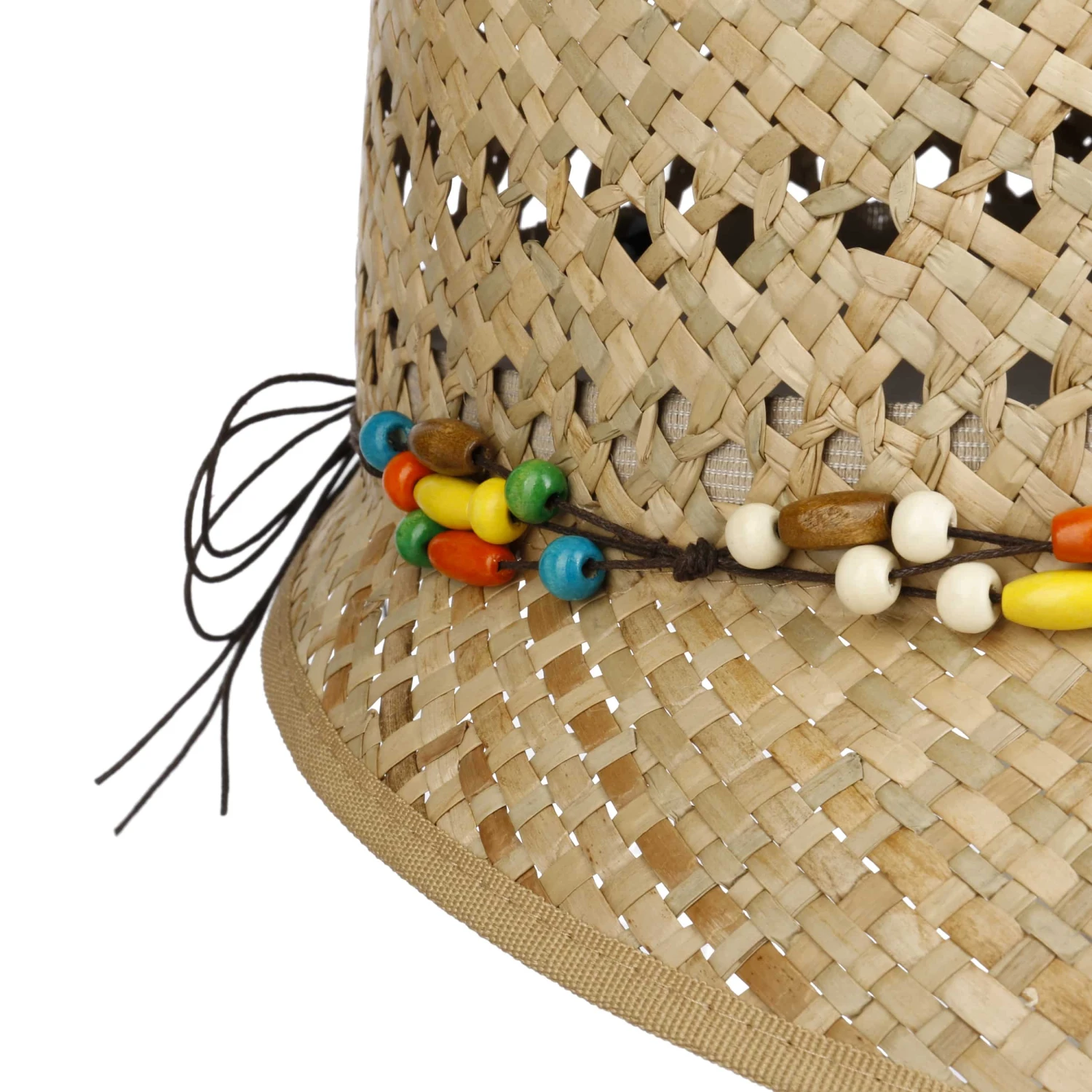 Die kurze Krempe des Urlaubshutes geht frontal in einen langen Schirm über. Der Kopfteil erregt mit einem groben Flechtmuster Aufmerksamkeit. Dieses erweist sich nicht nur als optisches Highlight, sondern sorgt auch für eine angenehme Luftzirkulation. Ein von mehrfarbigen Perlen besetztes Garniturband rundet den dynamischen Look mit verspieltem Charme ab.