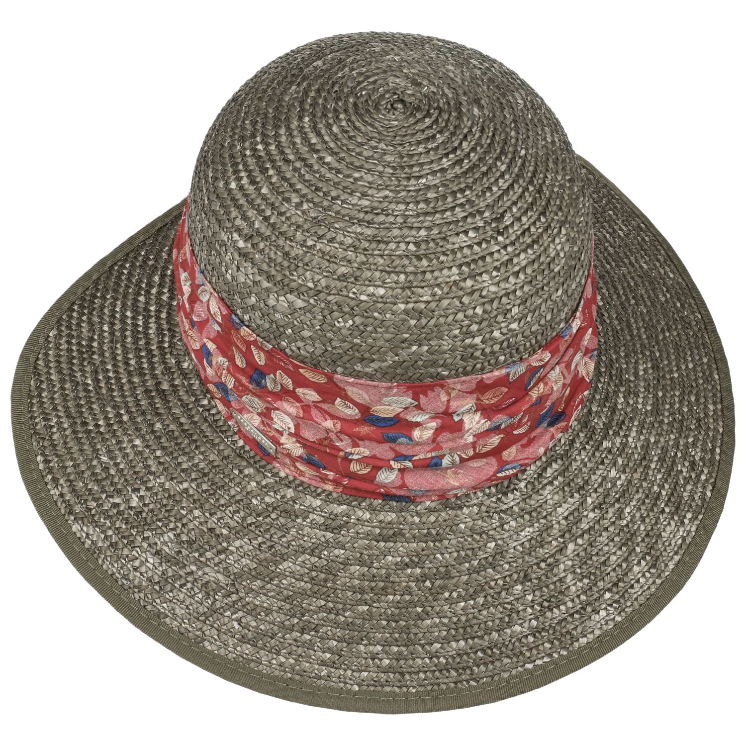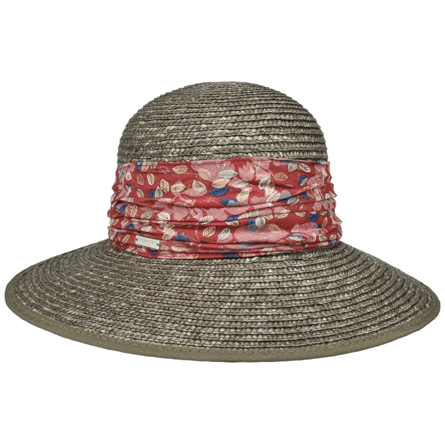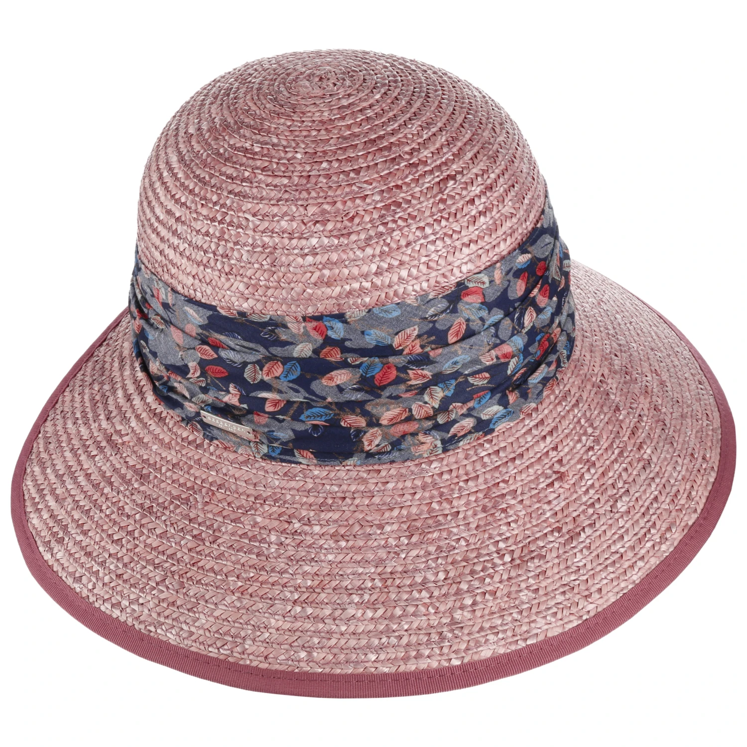 Um die Krone herum umgibt sich der Strohhut mit einer breiten, floral gemusterten Stoffgarnitur, was die feminine Ausstrahlung unterstreicht und den Sommerhut zum Blickfang macht.