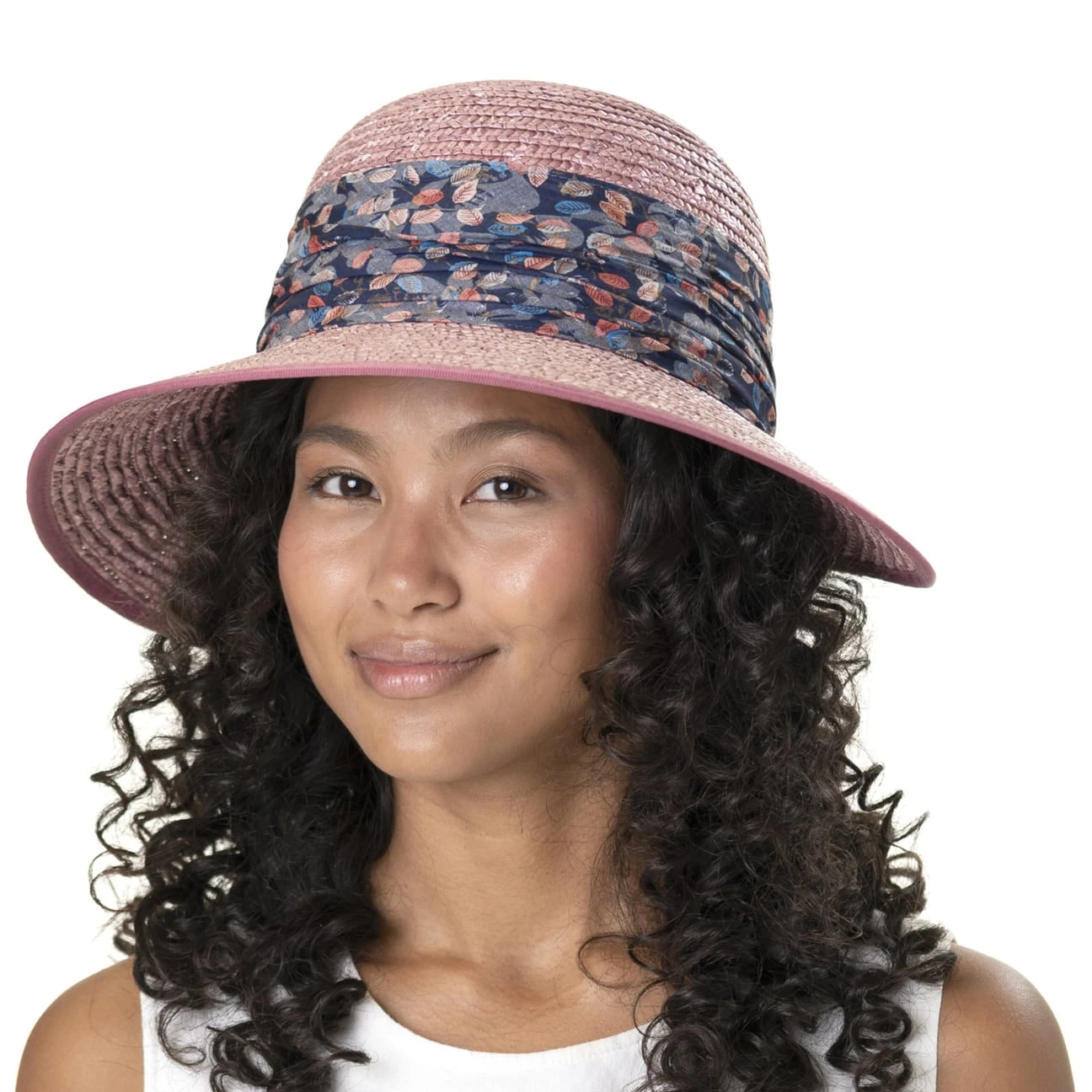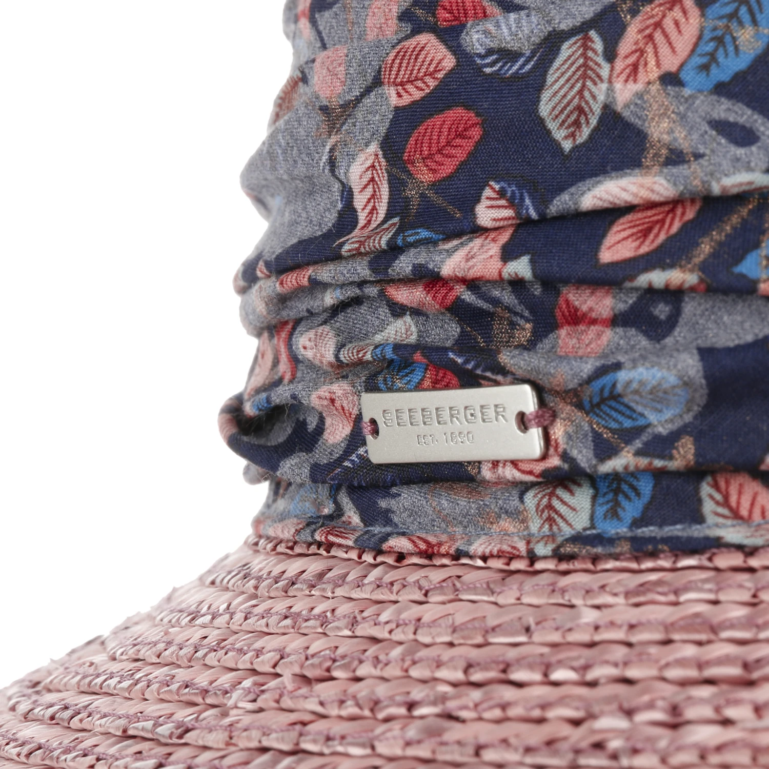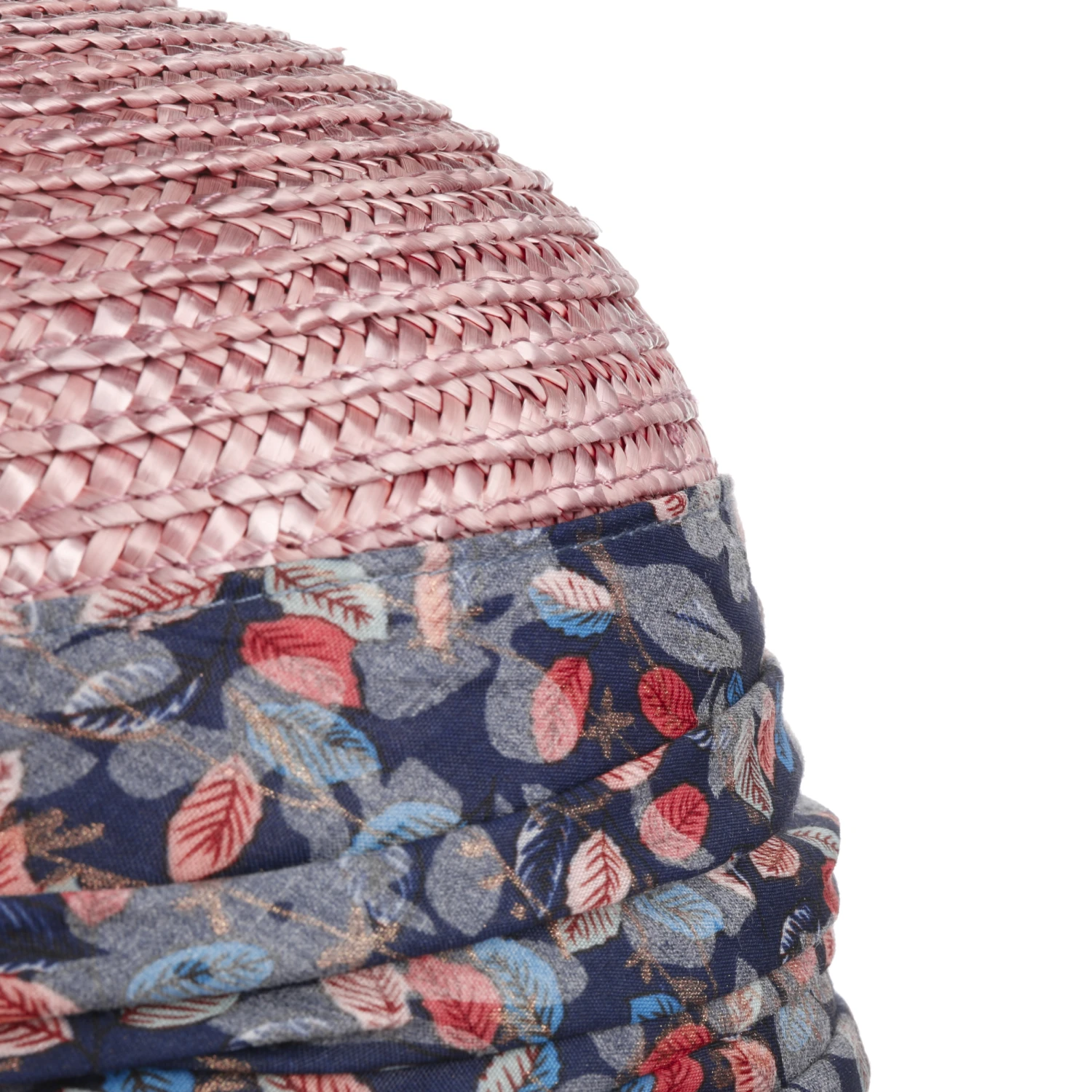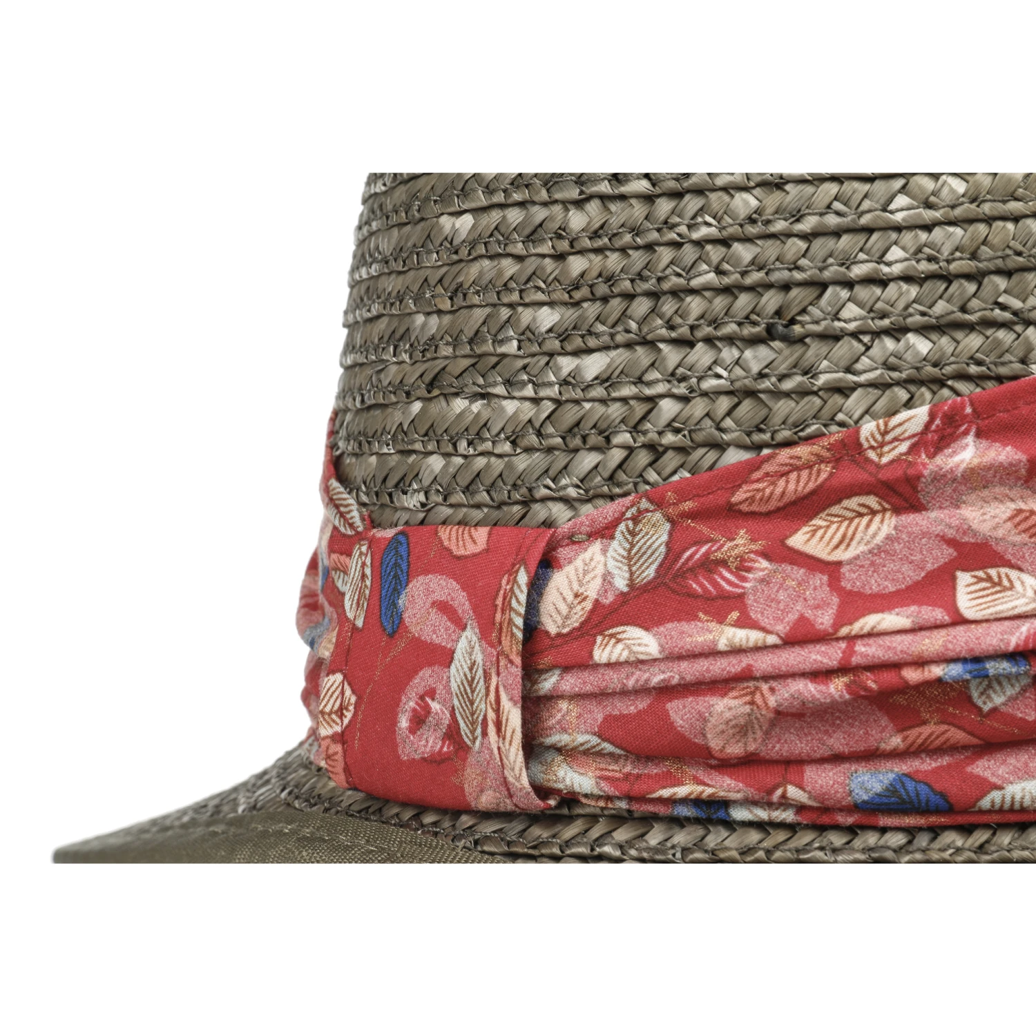Um die Krone herum umgibt sich der Strohhut mit einer breiten, floral gemusterten Stoffgarnitur, was die feminine Ausstrahlung unterstreicht und den Sommerhut zum Blickfang macht.