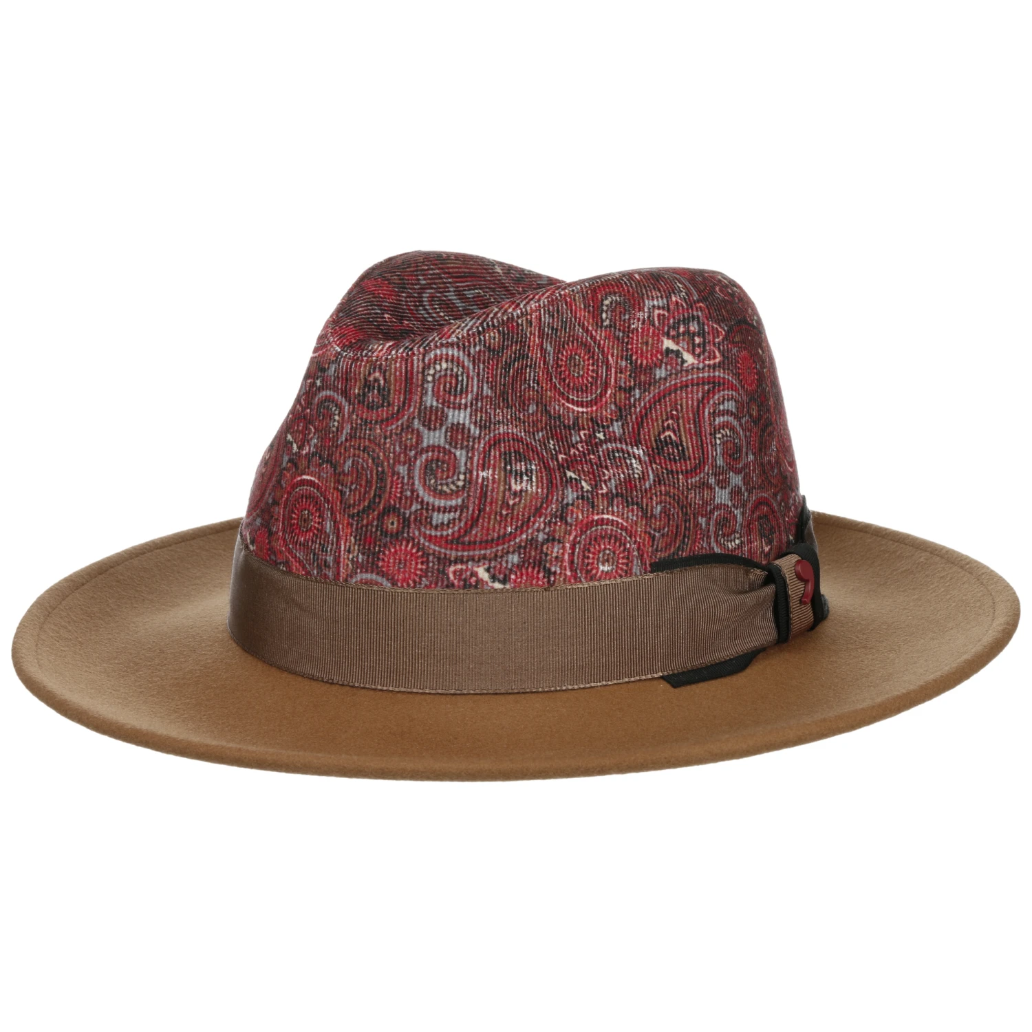 Innen verwöhnt er den Kopf mit einem Futter aus Baumwolle, das hautsympathische Eigenschaften mitbringt. Optisch hat sich der Filzhut etwas Besonderes einfallen lassen: Die Krempe zeigt sich unifarben, ebenso die breite Ripsbandgarnitur, darüber erhebt sich anmutig die Krone im klassischen, zugleich in der Farbwahl modischen Paisleymuster.