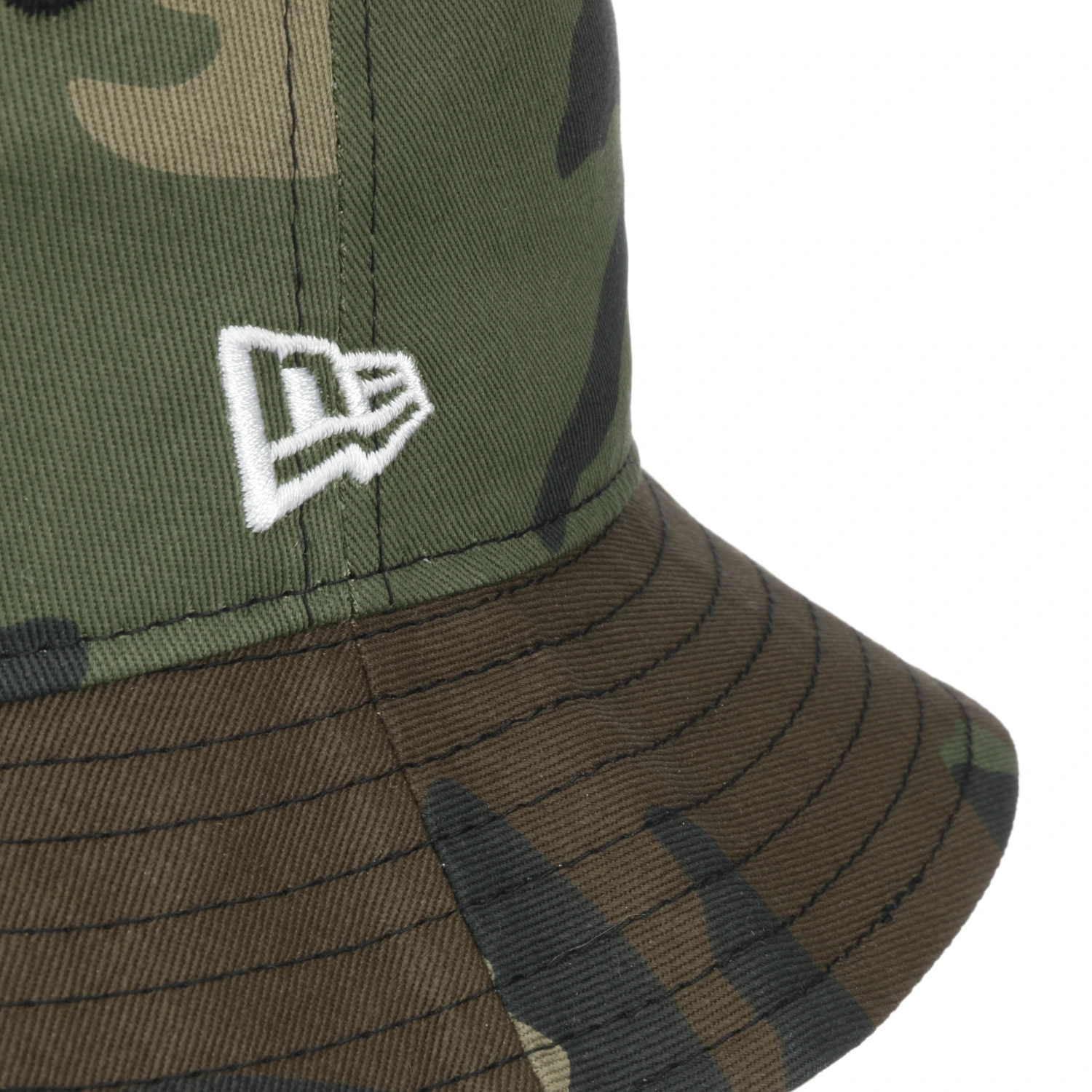 Als visuelles Highlight präsentiert der Bucket Hat von New Era ein klassisches Camouflage-Muster, das den kompletten Kopfteil wie auch die Krempe ziert.