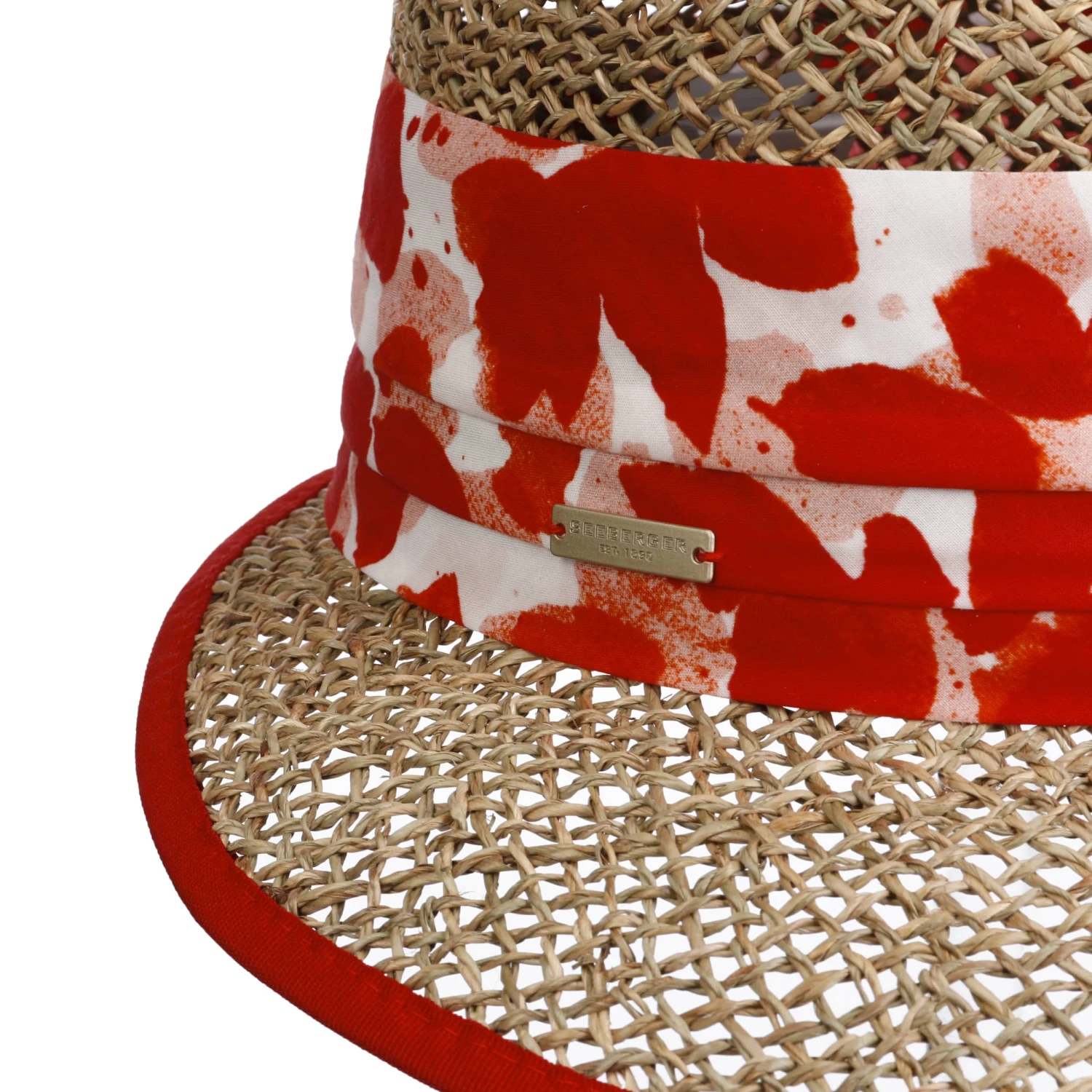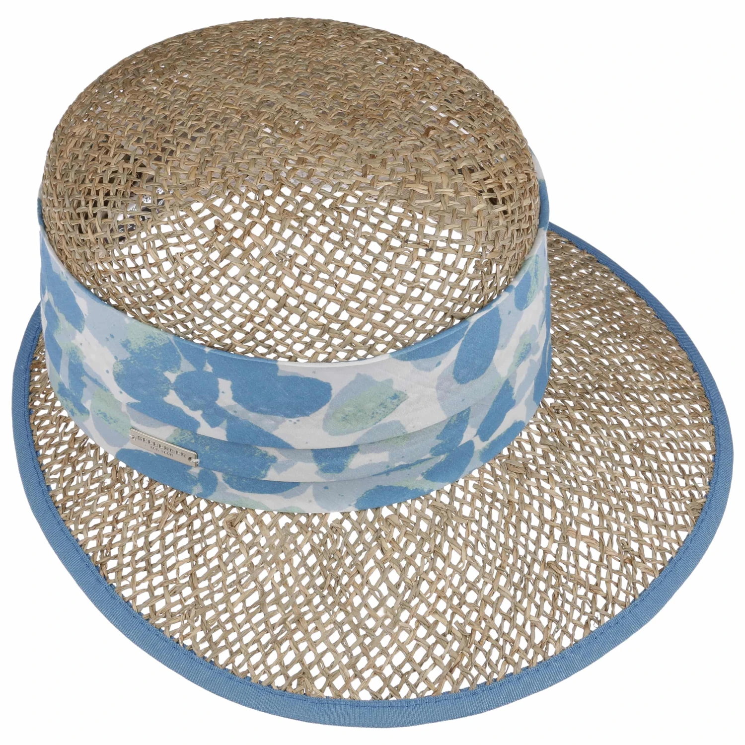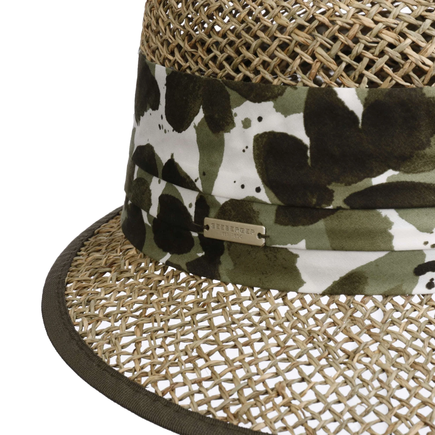 Der Strohhut von Seeberger kombiniert ein luftiges Geflecht aus Seegras mit einem breiten Garniturband aus Baumwollstoff.