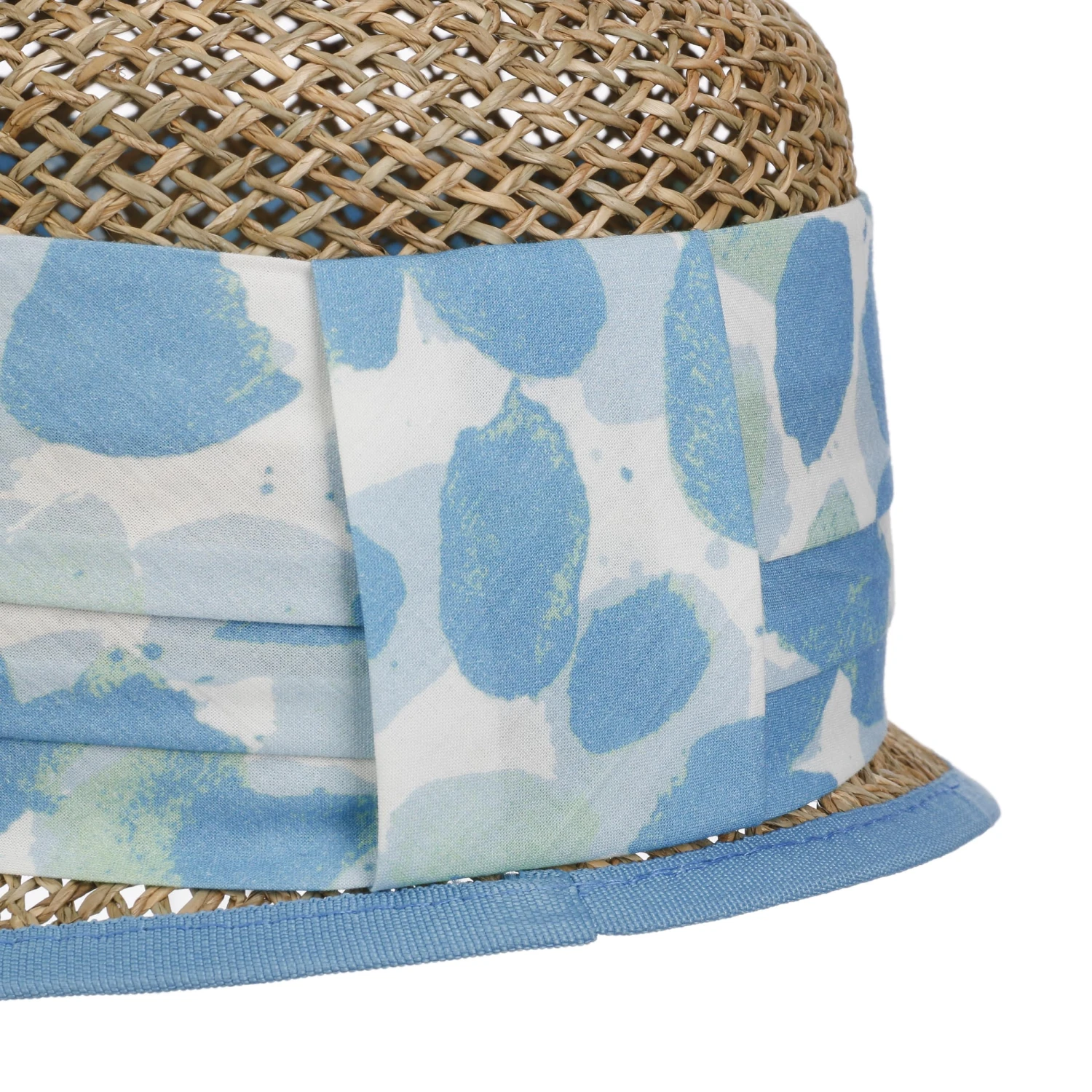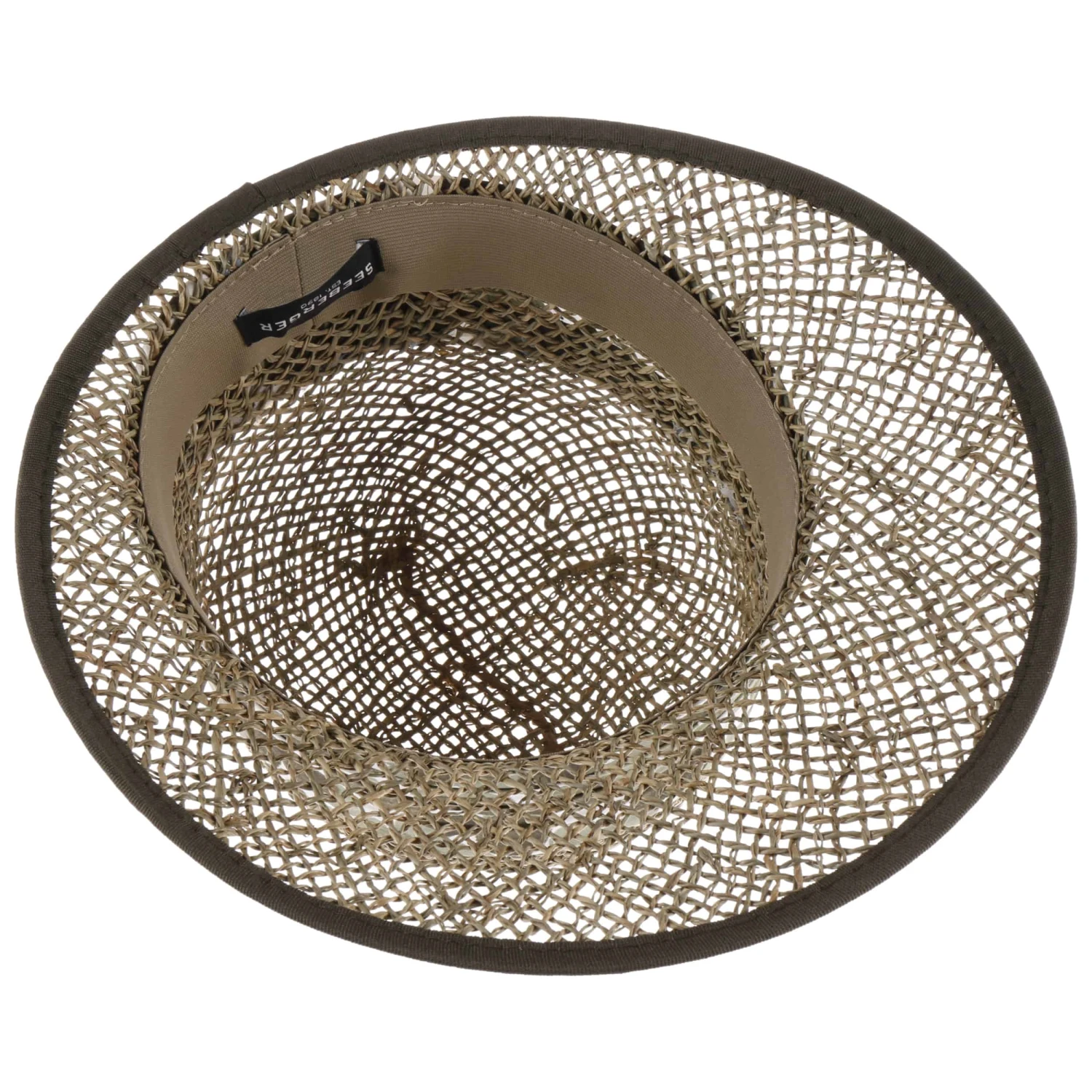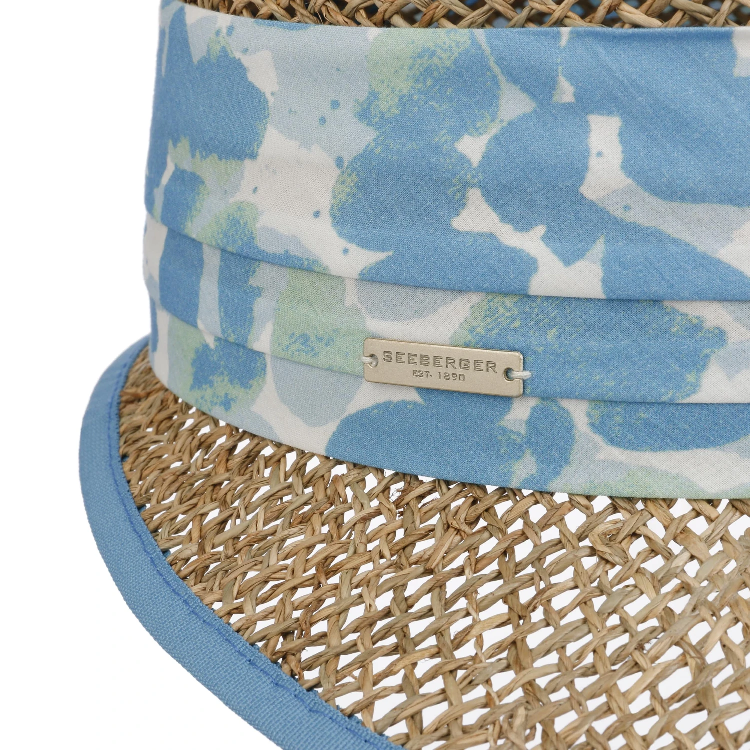 Der Strohhut von Seeberger kombiniert ein luftiges Geflecht aus Seegras mit einem breiten Garniturband aus Baumwollstoff.