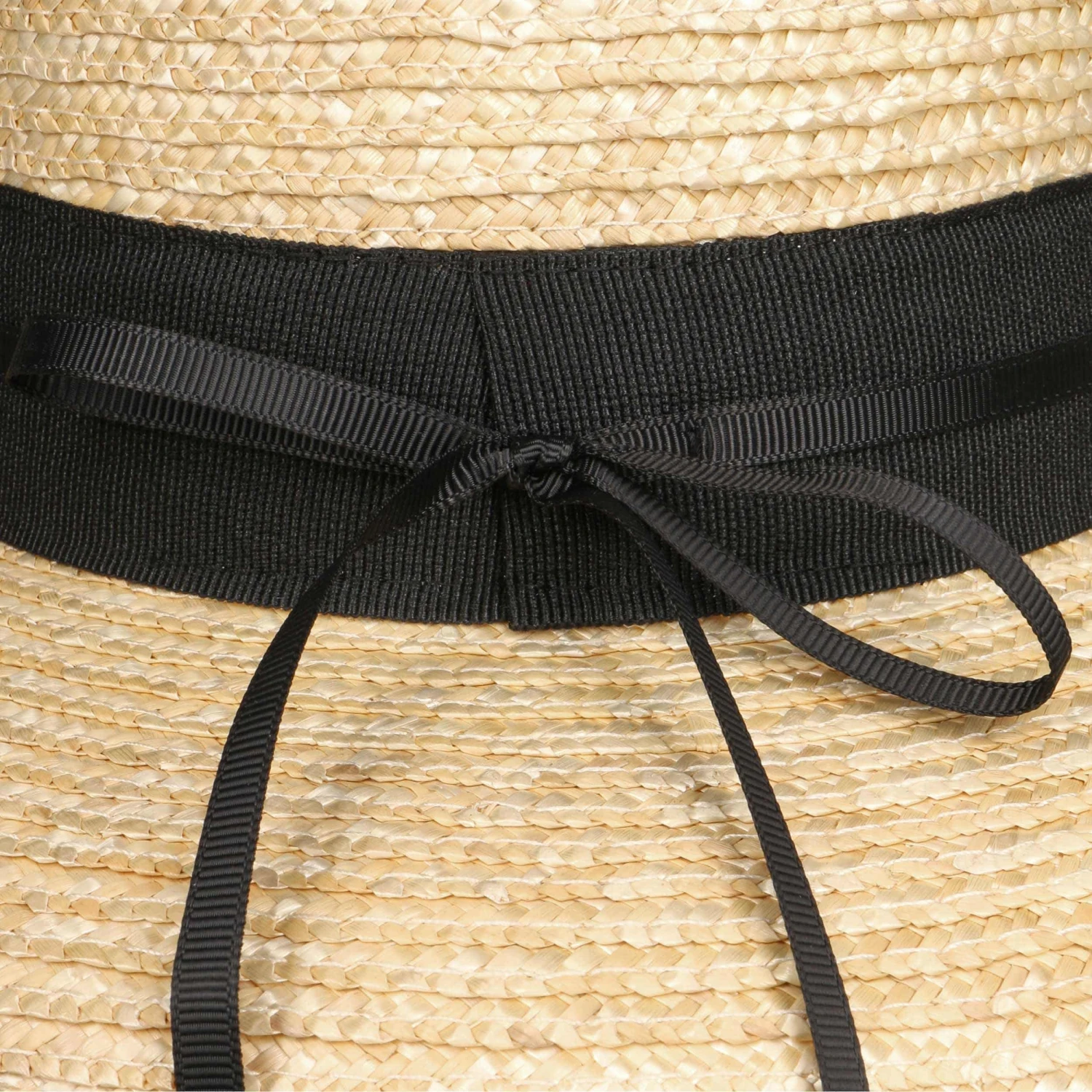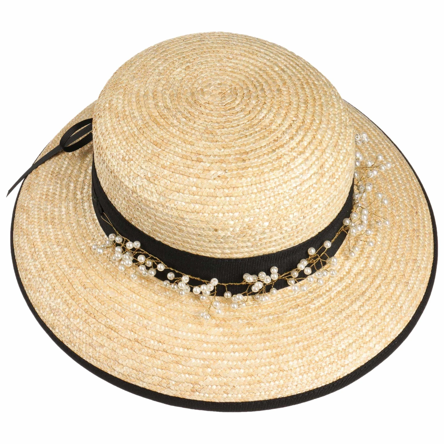 Auf dem farblich abgesetzten Garniturband, das sich rund um den Kopfteil des Strohhutes legt, liegt ein schimmerndes Geäst, das über und über mit Perlen verziert ist. Das romantisch anmutende Arrangement wirkt gleichermaßen natürlich wie auch mondän. Eine zarte Schleife rundet den Look adrett ab.