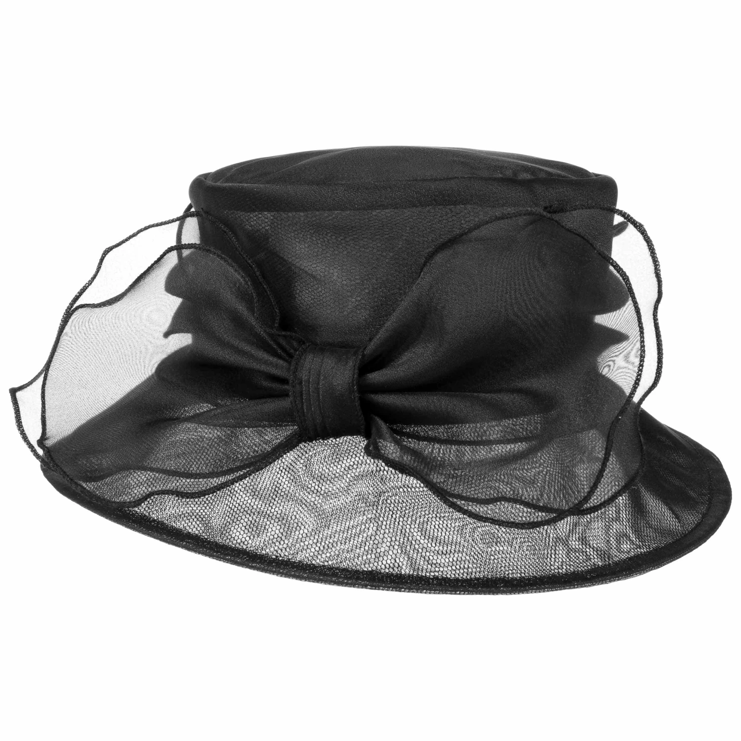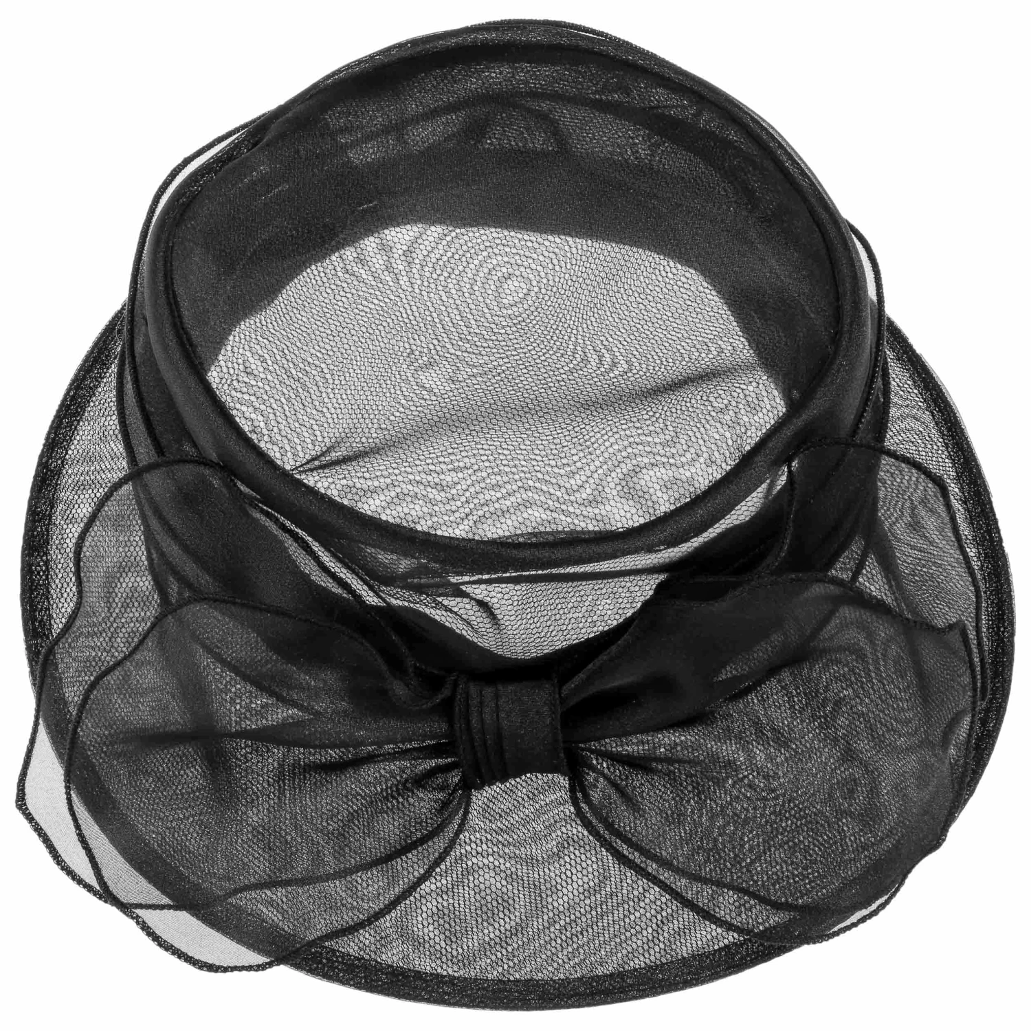 Eine voluminöse Schleifen-Applikation und die reizvolle Form mit nach unten geneigter Krempe verleihen der qualitativ hochwertigen Kopfbedeckung einen adretten Charakter. Die flache Krone wirkt dabei klassisch extravagant. Für besondere Eleganz sorgt das feine Netzgewebe, aus dem das Accessoire gefertigt ist.