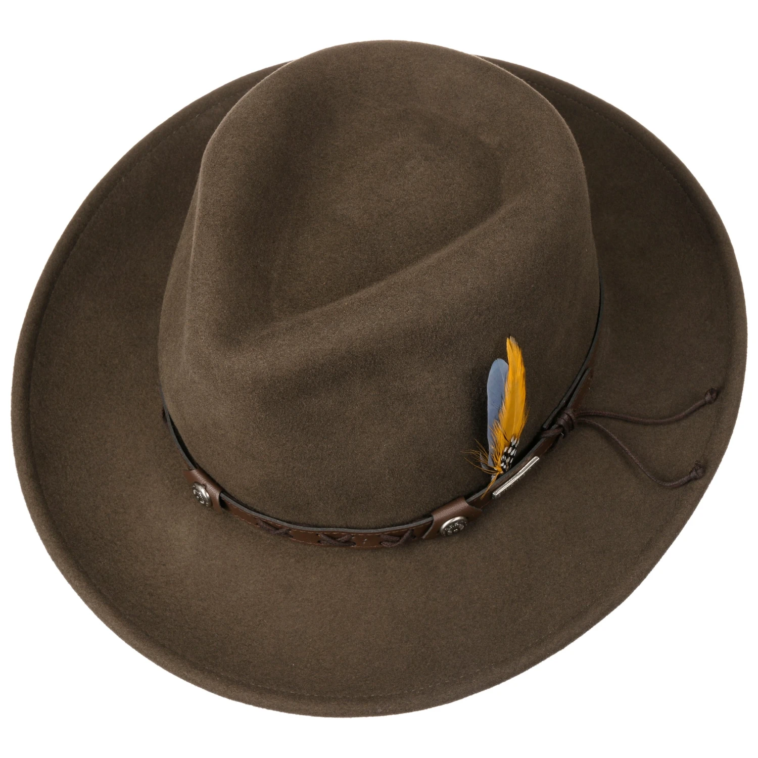 Die leichte Westernform mit der ursprünglichen Ledergarnitur verleiht diesem Filzhut seinen individuellen Ausdruck.