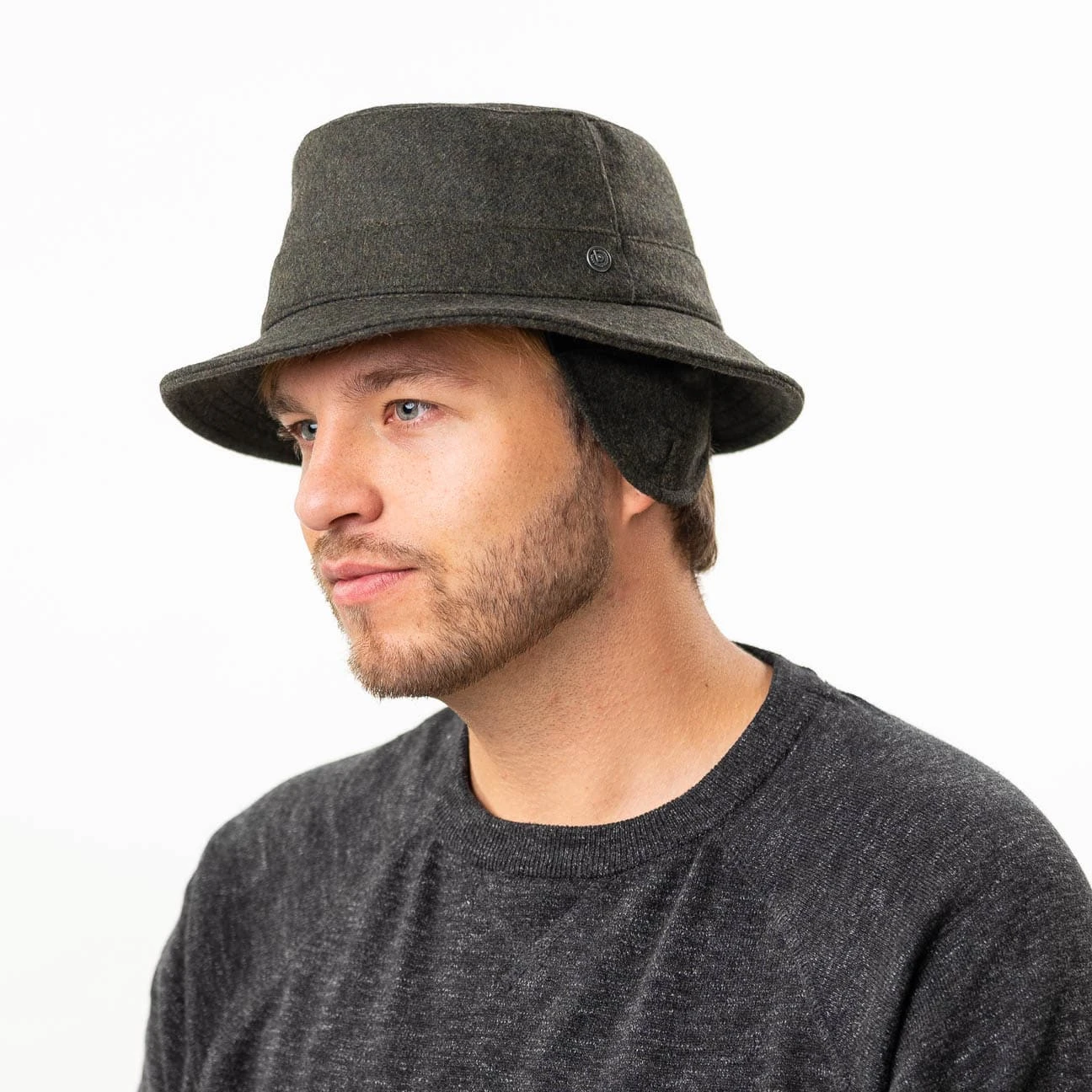 Wenn kalte Winde wehen, lässt er gerne seine Ohrenklappen herunter, um auch diesen etwas entgegenzusetzen. Wasserabweisend ist der schicke unifarbene Filzhut außerdem, weshalb er bei allen Outdooraktivitäten dabei sein darf.