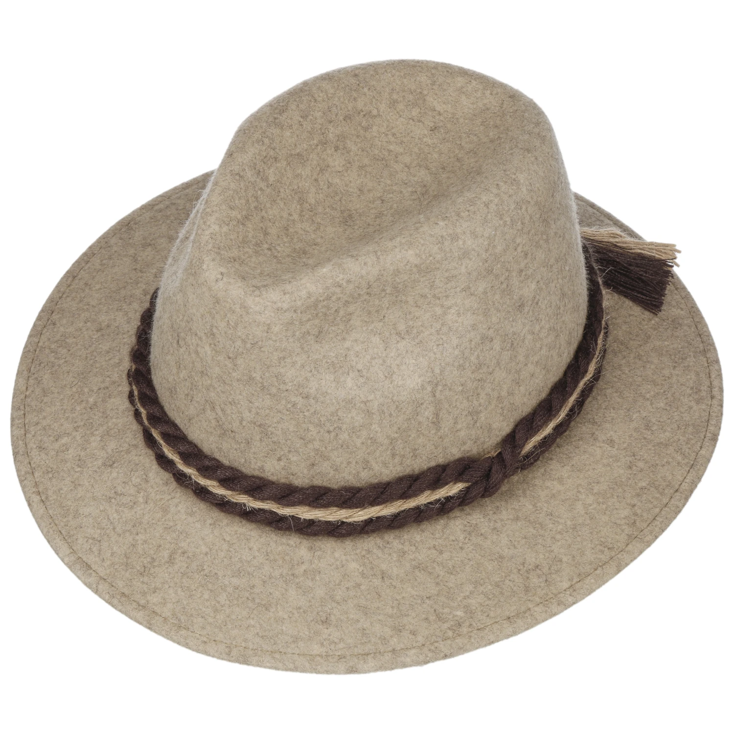 Der klassische Trachtenhut ist aus 100% weichem Wollfilz gefertigt und wird von einer mehrfarbigen Kordelgarnitur geziert, die am Hinterkopf in rustikalen Fransen ausläuft und so ein optisches Highlight setzt.